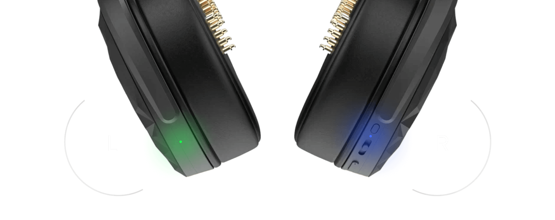 The indicator on the left headphone is glowing green, the indicator on the right headphone is flashing blue once per second: headphones are paired and connected to the app