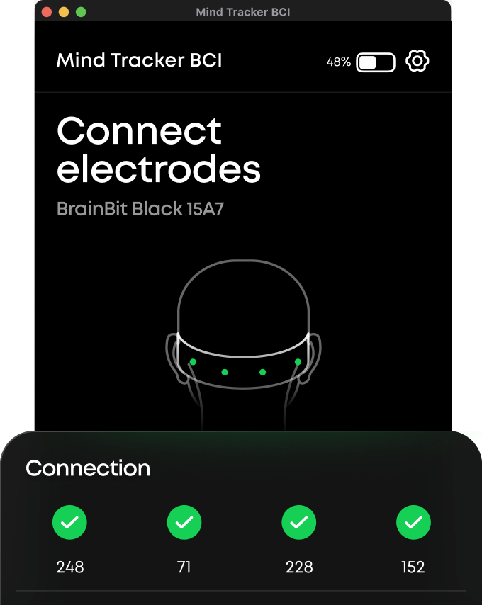 Indicator is glowing green: headband is paired and connected with Mind Tracker BCI