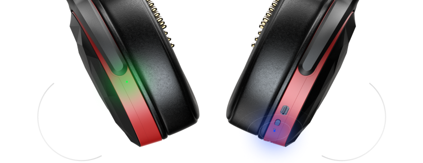 The indicator on the left headphone is glowing green, the indicator on the right headphone is flashing blue once per second: headphones are paired and connected to the app